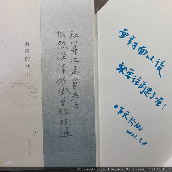 預購還有附特典〈海邊的診所〉!順便曬一下書卡跟簽名!每一本都不一樣的句子,太用心了吧這個簽名!